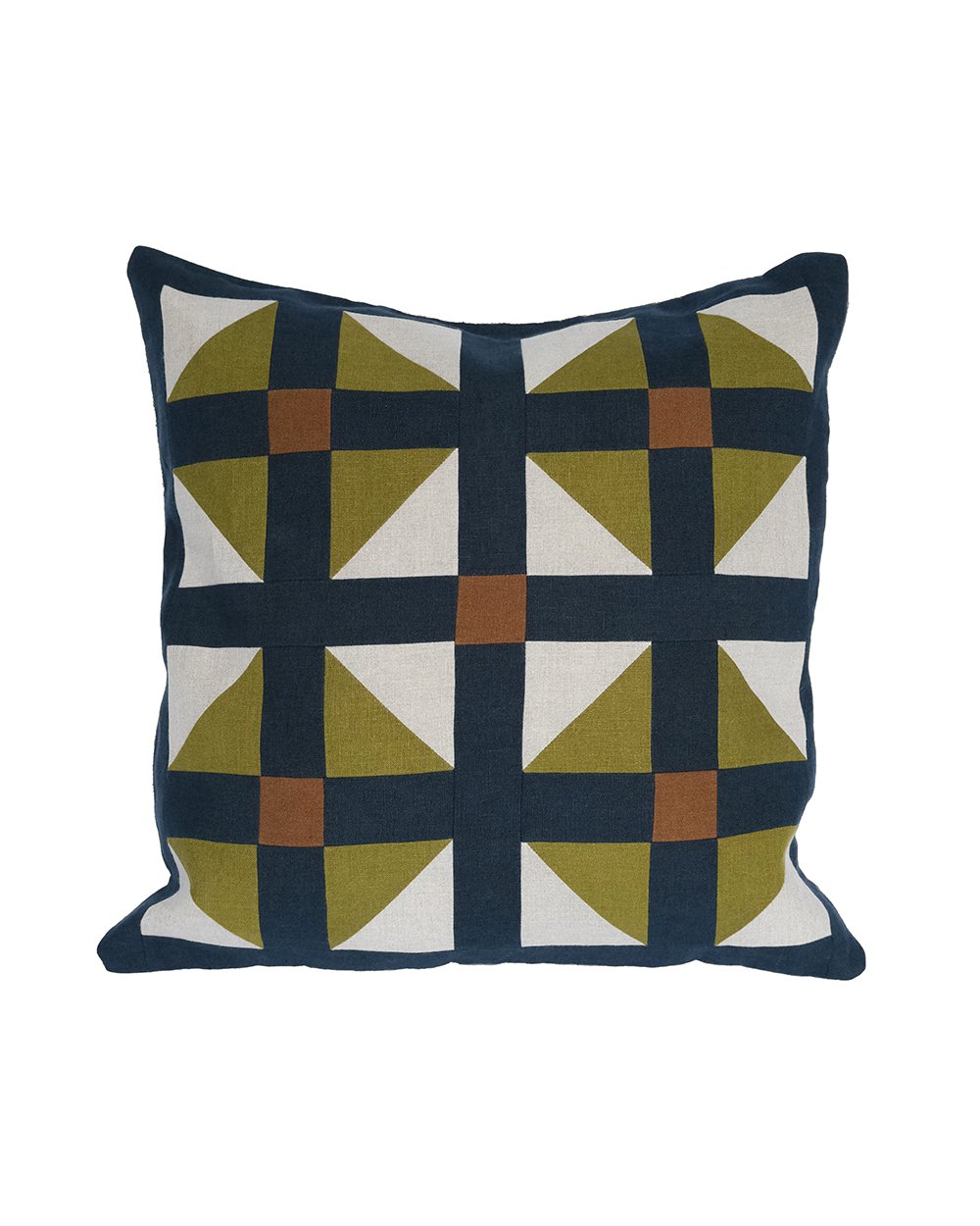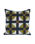 A patchwork cushion with a tessellating tile design in green, navy, brown and natural.