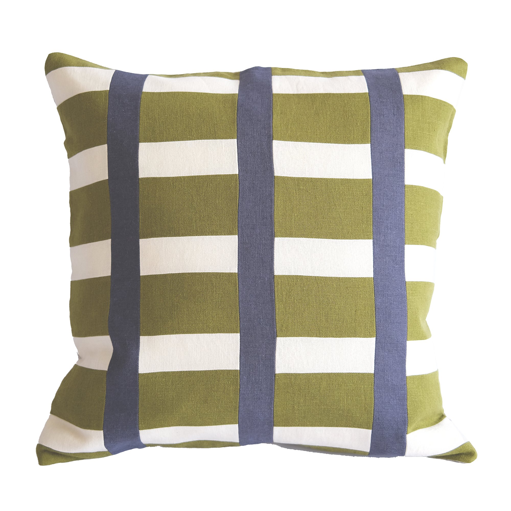 A patchwork cushion with a linear pattern design inspired by the simple, clean lines of Modernist architecture.
