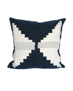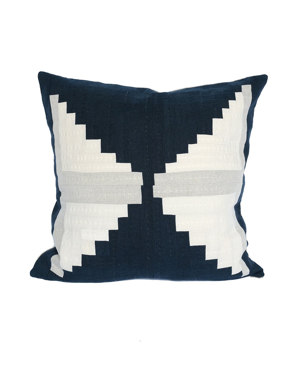 A one-off navy and cream improvised patchwork cushion. Made with scrap linen and cotton offcuts sewn in a traditional 'log cabin' pattern.